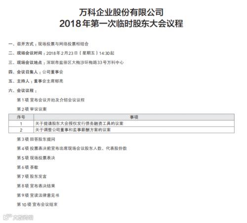 【14:15】万科企业股份有限公司2018年第一次临时股东大会议程如下。