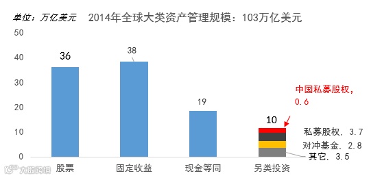 从2014年全球可配置资产的大类和规模数据来看,整体资产管理规模为103万亿美元,其中:固定收益资产、股票资产投资各占38万亿、36万亿,现金等同类资产占19万亿,包含私募股权投资、对冲基金等另类投资资产约为10万亿。全球私募私募股权投资规模约为3.7万亿,而国内仅为0.6万亿。