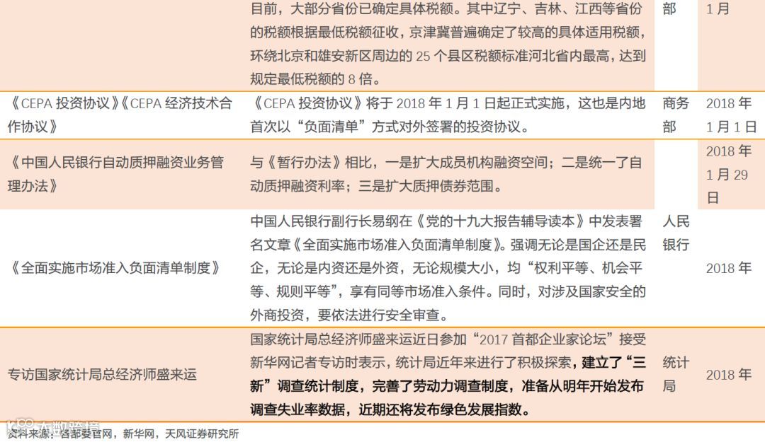 我们也梳理了2018年即将落地实施的一些其他重要经济政策,其中特别提醒大家关注的是:统计局表示,国家准备从明年开始发布调查失业率数据,近期还将发布绿色发展指数。