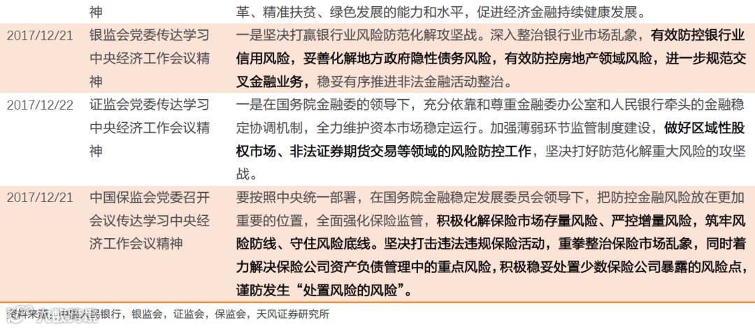 而具体到银监会、证监会和保监会层面,又明显细化了风险的具体内涵,包括:银监会提到的银行业信用风险,地方政府隐性债务风险,房地产领域风险等;证监会提到的区域性股权市场、非法证券期货交易等领域的风险防控工作;以及保监会提到的保险公司资产负债管理中的重点风险以及“处置风险的风险”等。