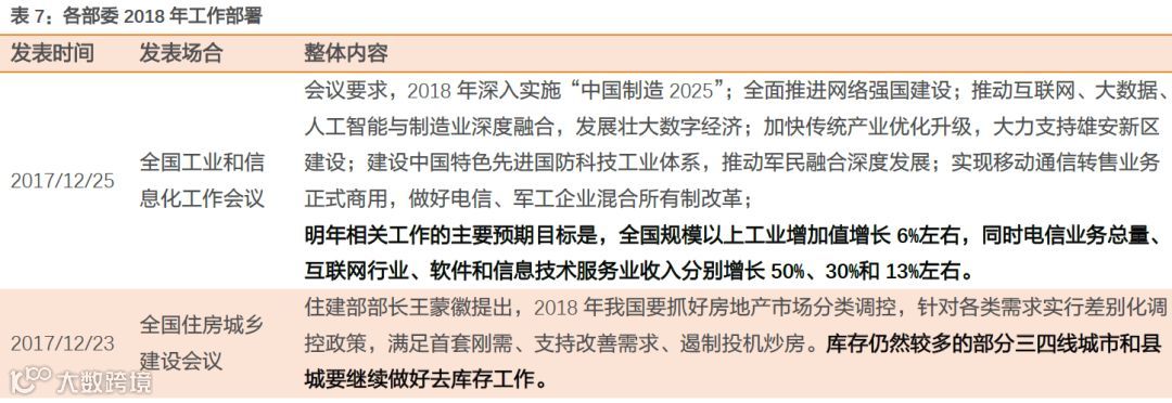在以上基础上,各部委2017年年度工作会议均已召开,基本上都立足于中央经济工作会议展开部署。我们以中央经济工作会议为主线,来看一下2018年各部委的具体化的工作部署有哪些?