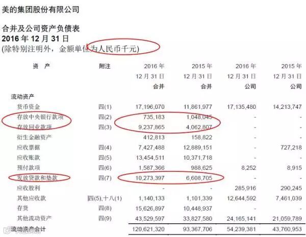 业内人士指出,美的虽然主业为制造业,但通过查看其报表,不难发现,美的已经悄然成为规模较大的专业金融与投资业务的机构。截至2016年年底,美的集团发放贷款和垫款超100亿元,同时也有银行同业业务92亿元和存放中央银行款项。