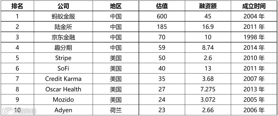 图表:全球Fintech独角兽公司Top10(单位:亿美元)