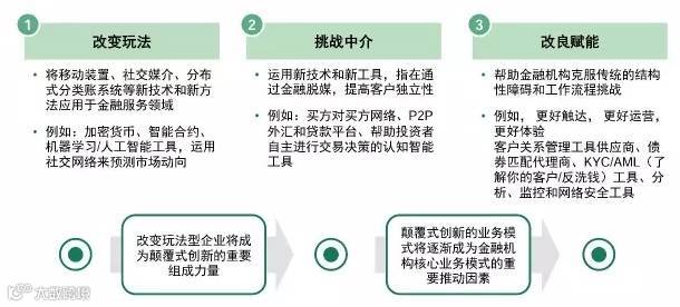 相比之下,金融科技则致力于改善和革新原有业务体系中最为基础的要素,例如用金融云替代传统的终端计算,通过大数据为目标客户画像等等;目前来看,Fintech仍然隶属于传统金融,它既不追求商业模式的创新,也不改变既有金融模式中的产品与渠道,它只专注于通过科技手段的进步实现效率提升,以保障并推动传统金融更快、更好的发展。我们所熟知的金融科技,包括智能投顾、大数据风控等等,均是传统的金融业务(资产配置、信用风控等)与新技术的结合。当然,尽管现在金融科技企业主要致力于帮助传统金融优化服务,但在未来,并不排除越来越多的金融科技企业会在服务领域中表现得更加积极、甚至亲自上阵,而到那时,整个金融服务领域必将会面对一场新的创新与重塑,从这个角度来看,将金融科技企业定义为“未来颠覆者”的角色也属实至名归。
