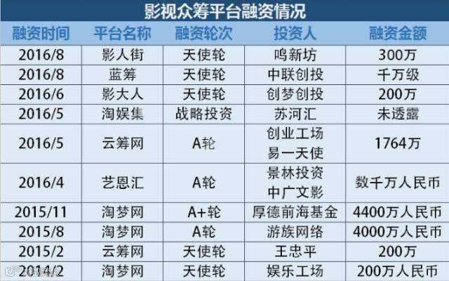 另一方面,经历了前期野蛮生长的众筹行业,风险和潜在问题都在不断凸显。2016年3月,随着监管当局对P2P展开专项整治,大量P2P平台借道“汽车众筹”,通过本制作假标的募集到资金后挪作他用;而这种资金池+平台兜底的模式,与早期的P2P网贷极为相似,直接导致了下半年开始汽车众筹的风险集中爆发;据不完全统计,截止2016年11月底,汽车众筹行业出现停业、清盘、失联、提现困难等情况的平台至少达到了52家。相比之下,这两年来投融两旺、曾被视为“新风口”的影视众筹同样问题不断。因《叶问3》虚假票房问题而曝光的快鹿集团,其兑付危机在2016年继续发酵,苏宁众筹也因此深陷其中,尽管法院已经进行了资产保全,但平台方的实际损失看似依然无法避免;此外,王宝强的《大闹天竺》众筹项目也被曝出资金无法兑付,牵出了一桩近20亿资金的非法集资大案;而请来了陈小春站台的众筹影片《米国的星空》则遭遇了创始人的诈骗跑路,涉案金额超过2亿元。尽管在中国社会消费升级的大背景下,资本对影视众筹平台表现出了更大的宽容,2016年,依然有多家创业公司获得融资。不过由于电影行业的特殊性,很多时候即使是很优秀的电影项目,也会遭遇到不可避免的亏损,大型影业公司可以用多部影片来均摊成本,而众筹平台则并不具备这样的实力,对于亏损项目,平台是否应该回购?众筹过程中如何保障投资者的知情权?平台到底扮演什么角色?都引发了业内对影视众筹模式的讨论,而这些既是行业里的敏感话题,也是所有平台迈不过去的坎。
