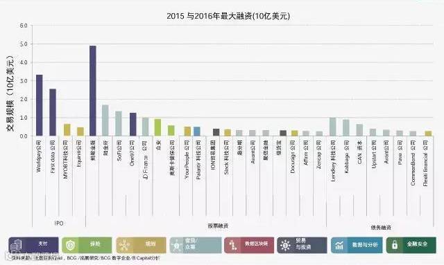 目前,中国的Fintech行业正处于快速发展期,且在行业内已经获得了领先地位。在2016年KPMG和H2联合发布的Fintech100的榜单中,排名前十的中国公司从2015年的两家增加到五家,入围前50的公司中有8家来自于中国,而在2014年该榜单中仅有一家中国公司入围。而根据BI的统计数据显示,在全球27家Fintech独角兽公司中有8家中国公司,其中估值排名前四的公司都来自于中国。