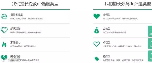 上海维情在旗下网站维情网称,其擅长挽救的婚姻类型包括第三者插足、感情淡化、家庭暴力、婆媳问题等;擅长分离的外遇类型包括感情型、金钱型、知己型、特殊型等。