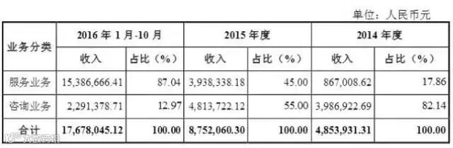 挖贝新三板研究院数据显示,在2014年、2015年,上海维情主要营业收入还是来自婚姻家庭咨询业务,但婚姻服务业务发展迅速,收入从2015年的393.84万元飙升至2016年1-10月的1538.67万元,成为上海维情主要盈利来源。