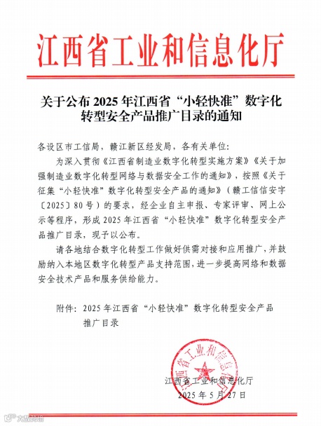 近日,江西省工业和信息化厅正式发布《2025年江西省“小轻快准”数字化转型安全产品推广目录的通知》(赣工信函〔2025〕80号)。经企业申报、专家评审及公示等严格程序,我司自主研发的企业数据安全保护系统成功入选网络与工控安全类推广产品(序号:37),标志着我司技术实力与产品价值获省级权威认可!