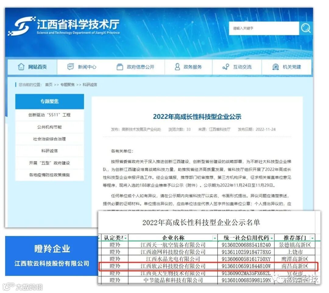 近日,江西省科学技术厅公示了2022年度“瞪羚企业”名单,江西软云科技股份有限公司以高速的成长性、跳跃式发展态势及独特的创新能力光荣登榜,被认定为2022年度省级“瞪羚企业”。