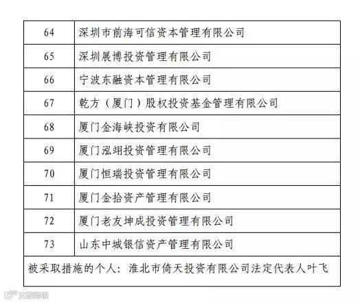 有73家私募机构和个人“榜上有名”,因为各种不合规行为被采取行政监管措施。其中不乏一些市场上名声响亮的私募机构,比如知名股权私募红杉资本、中植资本等,知名证券私募深圳展博投资、广东新价值投资、上海宝银创赢投资、广州创势翔投资等,还有唯一被处罚的个人是淮北市倚天投资法定代表人叶飞。