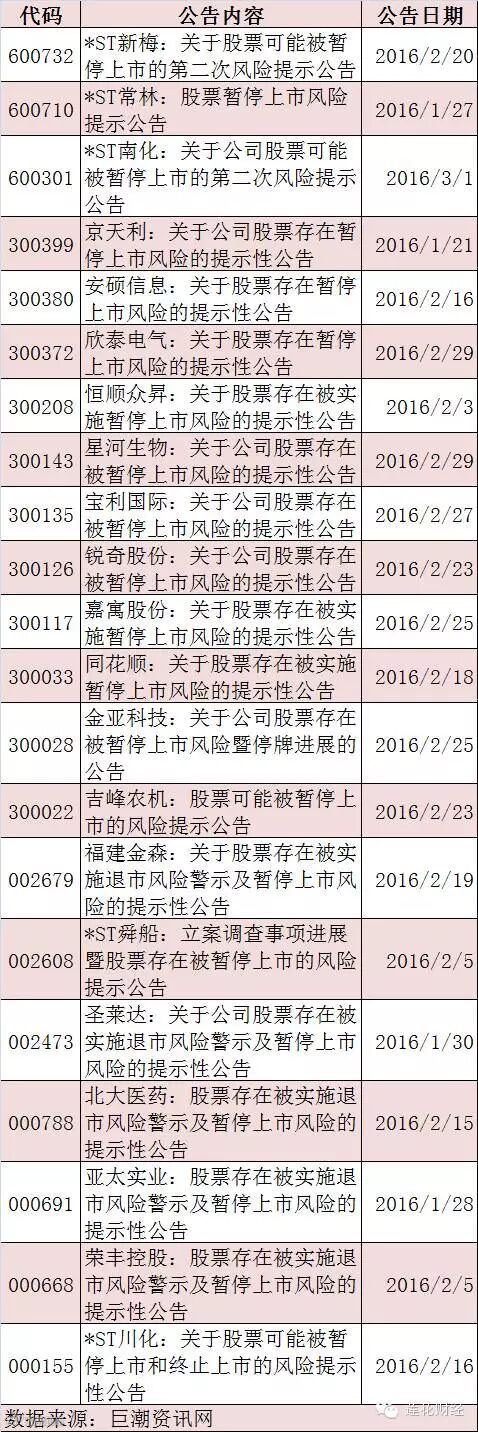 沪深两市目前已有*ST新梅、*ST常林和*ST川化由于连续三年亏损而处于暂停上市状态,这意味着这些公司可能被暂停上市甚至终止上市。除了业绩外,两市还有不少公司由于信息披露违法违规可能导致暂停上市或者退市风险的,欣泰电气更是由于涉嫌欺诈上市或将成为创业板退市第一股。