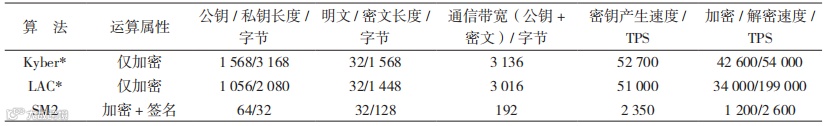 传统密码算法与后量子密码算法,特别是公钥密码算法,在算法参数尺寸、运算效率、算法机制等方面存在较大差异,不能简单地直接将传统密码算法替换成后量子密码算法。传统公钥密码算法,如 SM2,提供加解密、签名验签、密钥协商等功能;公、私钥长度为 64 字节和 32 字节,加密数据长度为任意字节,密文长度较明文数据长度增加 96 字节;签名原文数据长度任意,经过杂凑后进行签名,签名结果长度为 64 字节;可与 Diffie-Hellman 算法结合进行密钥协商。但单种后量子密码算法不能提供全面的运算功能,可将它们可分为两类:一类为密钥封装算法,如 Kyber768,提供加解密、密钥封装等功能,公、私钥长度为 1 184 字节和 2 400 字节,密钥封装功能原文数据长度为 32 字节,封装密文长度为 1 088 字节,不可与 Diffie-Hellman 算法结合作密钥协商;另一类是签名算法,如 Dilithium3,仅提供签名验签功能,公、私钥长度为 1 952 字节和 4 000 字节,签名长度为 3 293 字节。在运算速度上,部分后量子公钥密码算法较 SM2 算法更快,如 Kyber768 使 用 高 级 向 量 扩 展(Advanced Vector Extensions,AVX) 并 行 指 令 优 化 后 较 SM2 快 10倍左右,另一些后量子公钥密码算法较 SM2 慢很多,如 Sphincs+ 的签名速度是 SM2 的约千分之一。表 1 列出了部分对比结果,其中,* 表示使用 CPUAVX2 加 速, 在 I5 1135G7 2 核 CPU 上 测 试;LAC是我国学者提出的密钥封装算法。