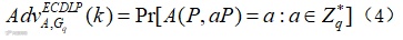 的唯一整数x ,在限定时间内多项式算法A解决椭圆曲线离散对数问题(Elliptic Curve Discrete Logarithm Problem,ECDLP)问题的概率为: