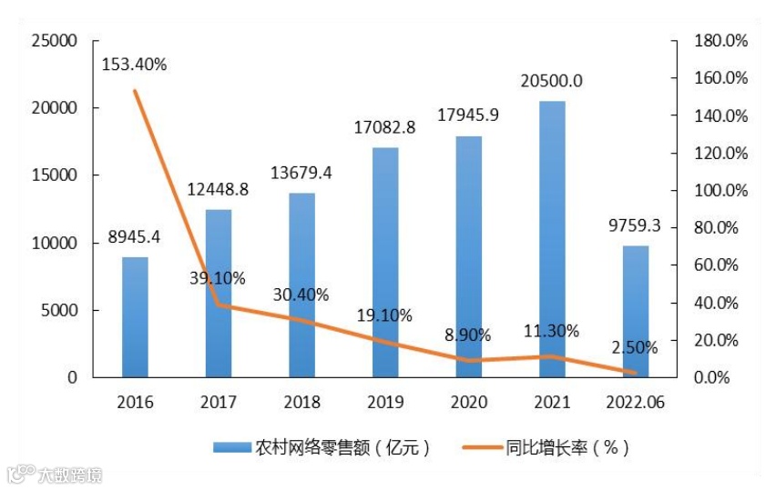商务大数据监测显示,2021 年全国农村网络零售额 2.05万亿元,占全国网络零售额的 15.66%,同比增长 11.3%。2022年上半年,全国农村网络零售额9759.3 亿元,同比增长2.5%。其中,农村实物商品网络零售额8904.4 亿元,同比增长3.6%。