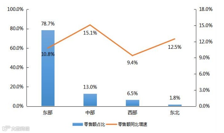 分地区看,东部、 中部、西部和东北地区农村网络零售额分别占全国农村网络零售额的 78.7%、13.0%、6.5%和 1.8%,同比增速分别为 10.8%、15.1%、9.4%和 12.5%。