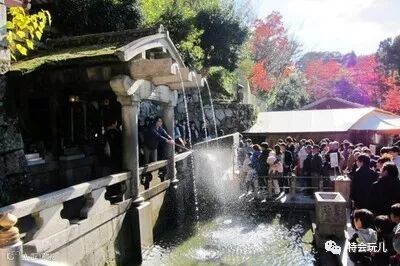 从舞台下流出的三泓清水叫音羽瀑布。清水寺就因此得名。据说用柄杓舀起那滚滚涌出的灵泉水喝一口的话,能延年益寿,万事如意。