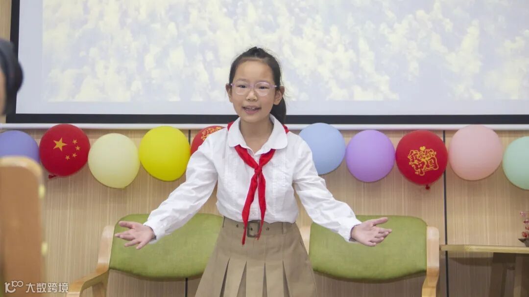 《我的思念是圆的》、《中国话》……现场播放着各种关于中秋节的视频和歌曲,少先队员们在主持人的介绍下朗诵关于中秋佳节的诗歌、散文等。在诗朗诵中,少先队员们用他们优美动听的声音表达了对祖国母亲的祝福。