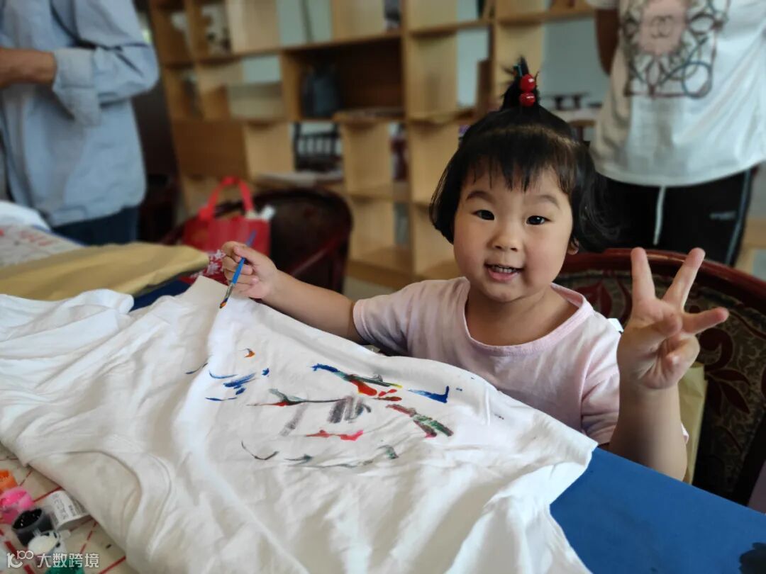 2岁的熹熹小手握着画笔,正认真地画着衣服上的“线条”,工作人员走近,熹熹还一脸认真地说:“这是要送给我的爸爸的。看,多好看呀!”说完继续在衣服上创作着。