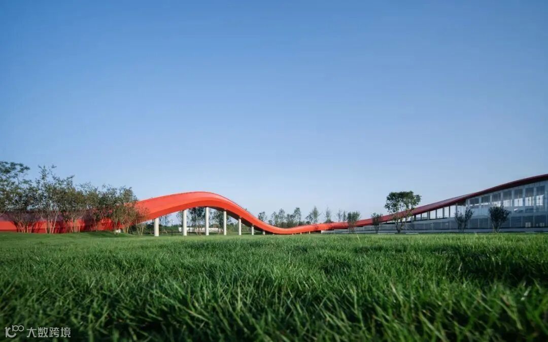 红色步道是整个“智慧之环”最出彩的屋面部分,屋顶和立面均为曲线形设计,屋顶为金属曲面,由15218片铝板拼接而成,立面为玻璃曲面,共计700块玻璃,6000㎡面积,线条流畅,在形体上和自然景观融为一体,在材质上和绿化景观产生对比。