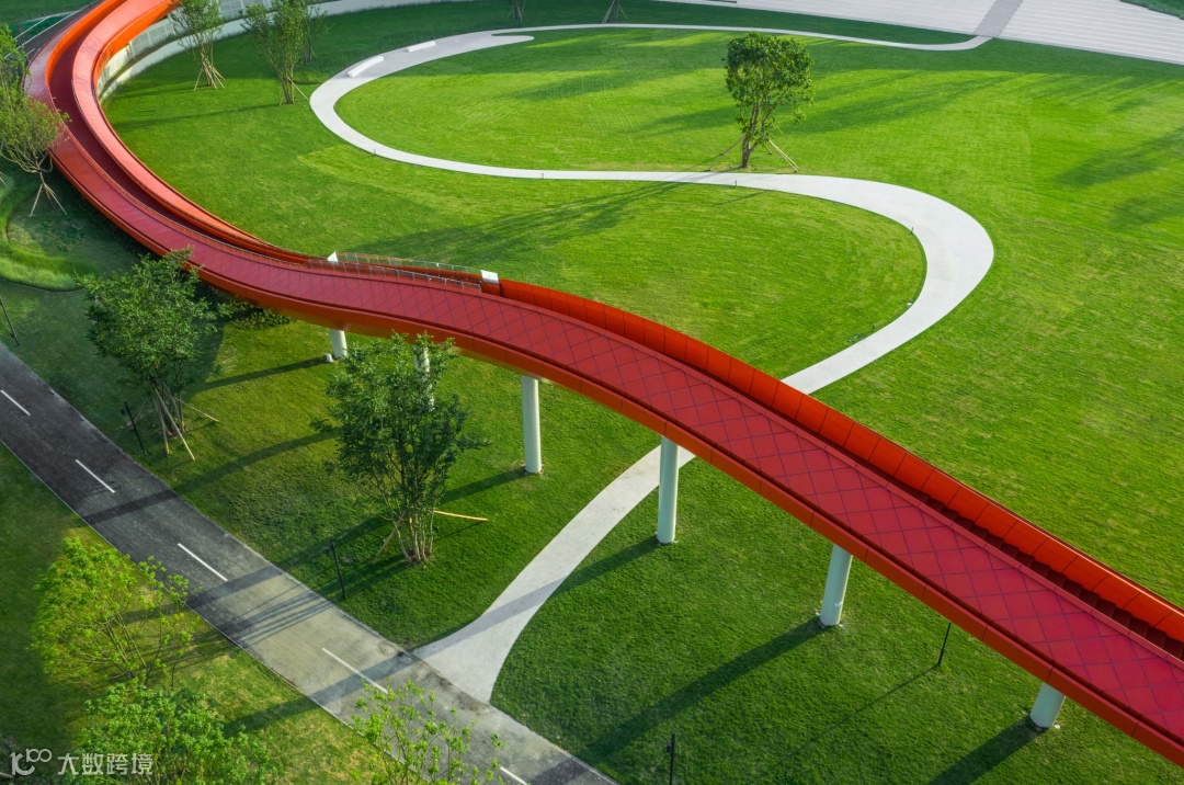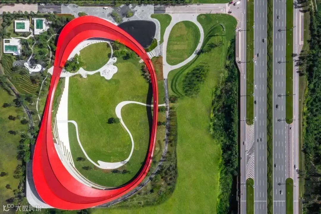 沿着天府大道一路向南,行至兴隆湖畔远远就能看到这座似莫比乌斯环形的建筑。红色塑胶跑道随着屋顶曲面高低起伏,中间环绕一个绿意盎然的公园,大家可以通过两个出入口从地面一路漫步到屋顶,在这条长达698米的跑道上肆意奔跑,在高高的平台上俯瞰城市。