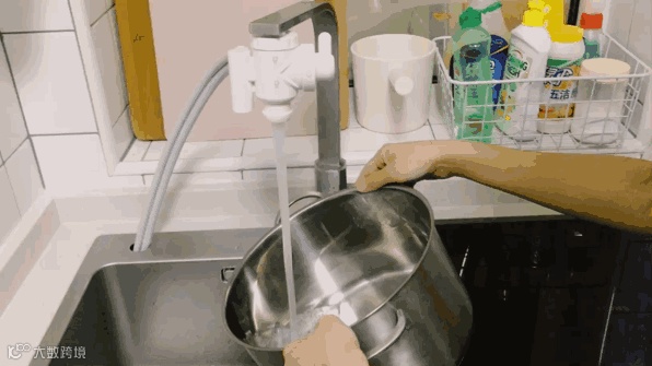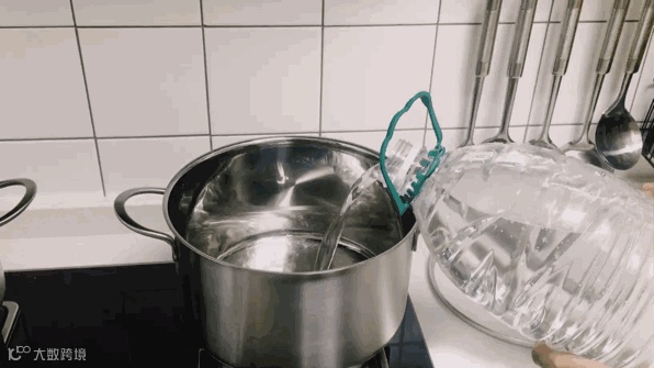 2. 取一只不锈钢锅,加水。煮沸后放入绿豆,3分钟后,舀出里面的汤,澄清透明。这就是绿豆皮煮出来的真正颜色。