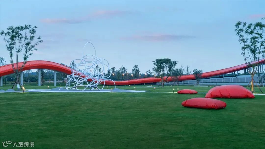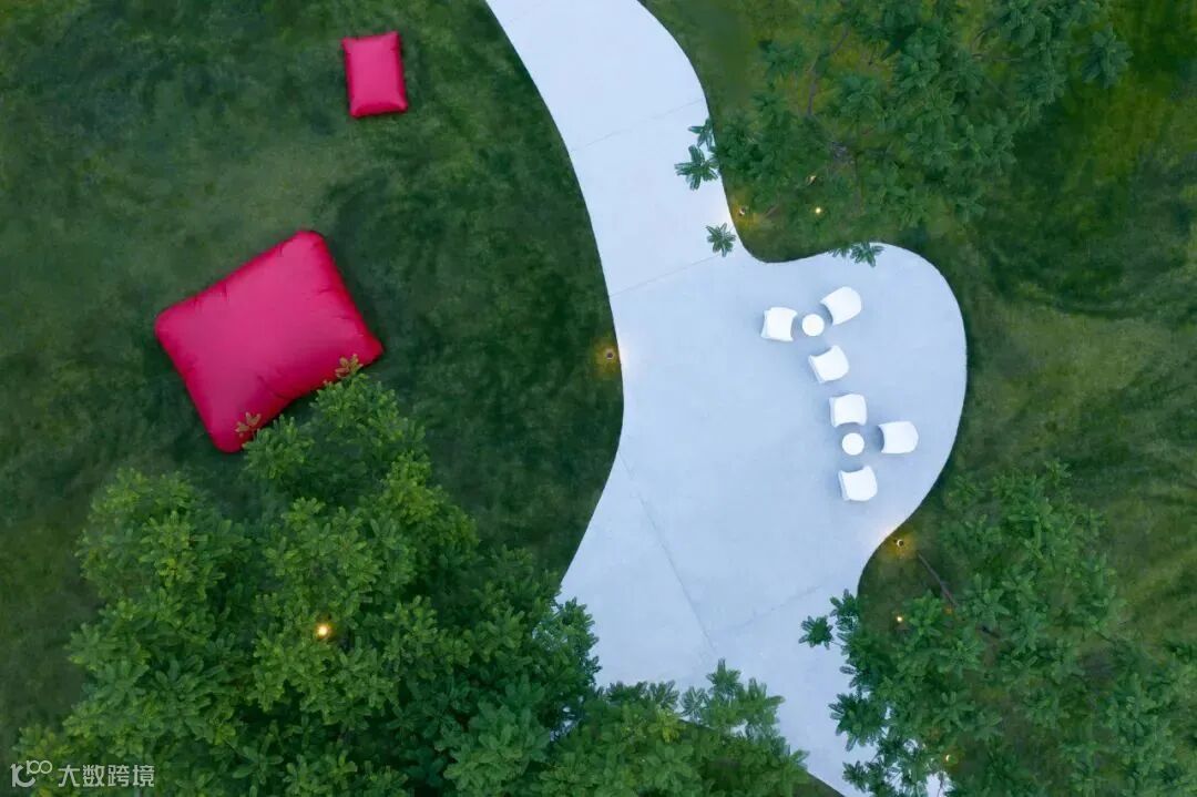 与建筑色彩呼应的红色“气泡枕头”,大小不一的散落在草地上,软乎乎的身体和超出常规的尺寸,仿佛在用诙谐的方式呼应建筑的超现实感,大人、儿童在此或坐或躺,是最休闲、轻松亲子时间。