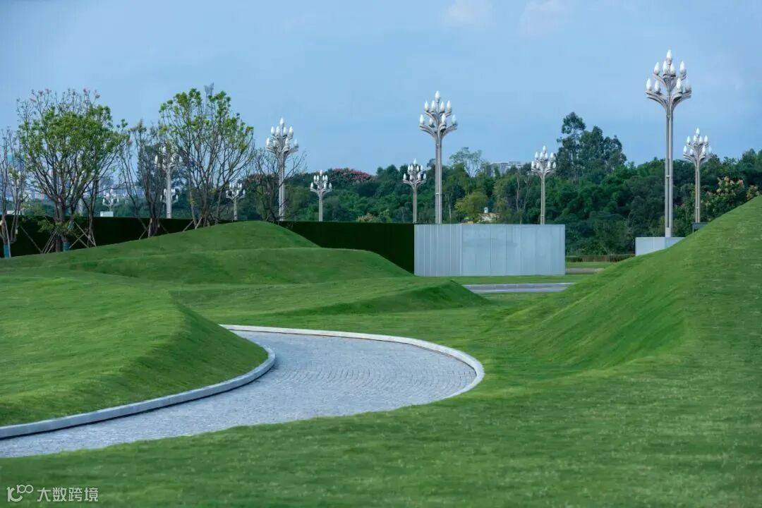 作为自天府大道看向“智慧之环”的第一立面,入口景观延续了建筑流畅的大尺度曲线,用大地造景的方式打造与建筑相匹配的艺术地景,柔和的起伏,似乎与建筑相生共生、浑然一体。在色彩上,大地艺术景观呈现出最自然的绿色,反衬了建筑未来感十足的红色。