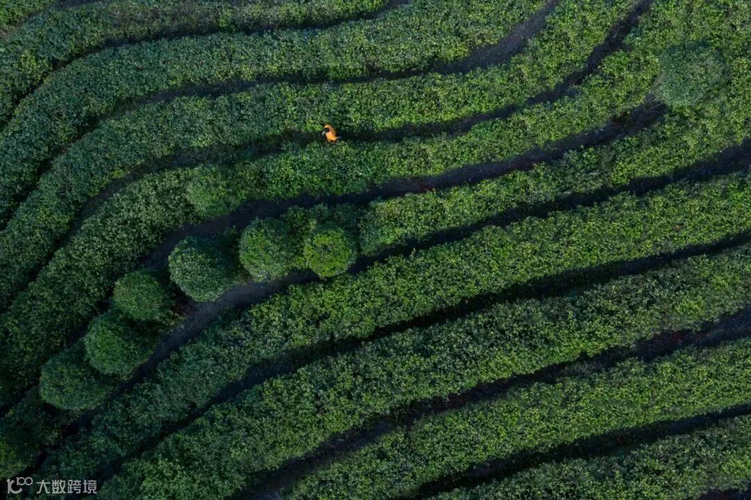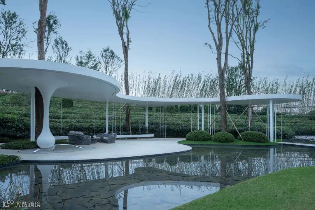 与未来感十足的开放广场,穿过建筑的空间则多了一份舒逸。顺着高差,种下一片茶山,提炼出云的线条,在云雾缭绕的半山茶园打造了一个抽象、飘逸的云亭,形成干净温婉的水岸休闲空间,以细节与意境体现场地优雅气质。身处其中,呼吸着茶山清新、醉人的空气,感受天地的纯净与空灵,是生活中的片刻静谧时光。