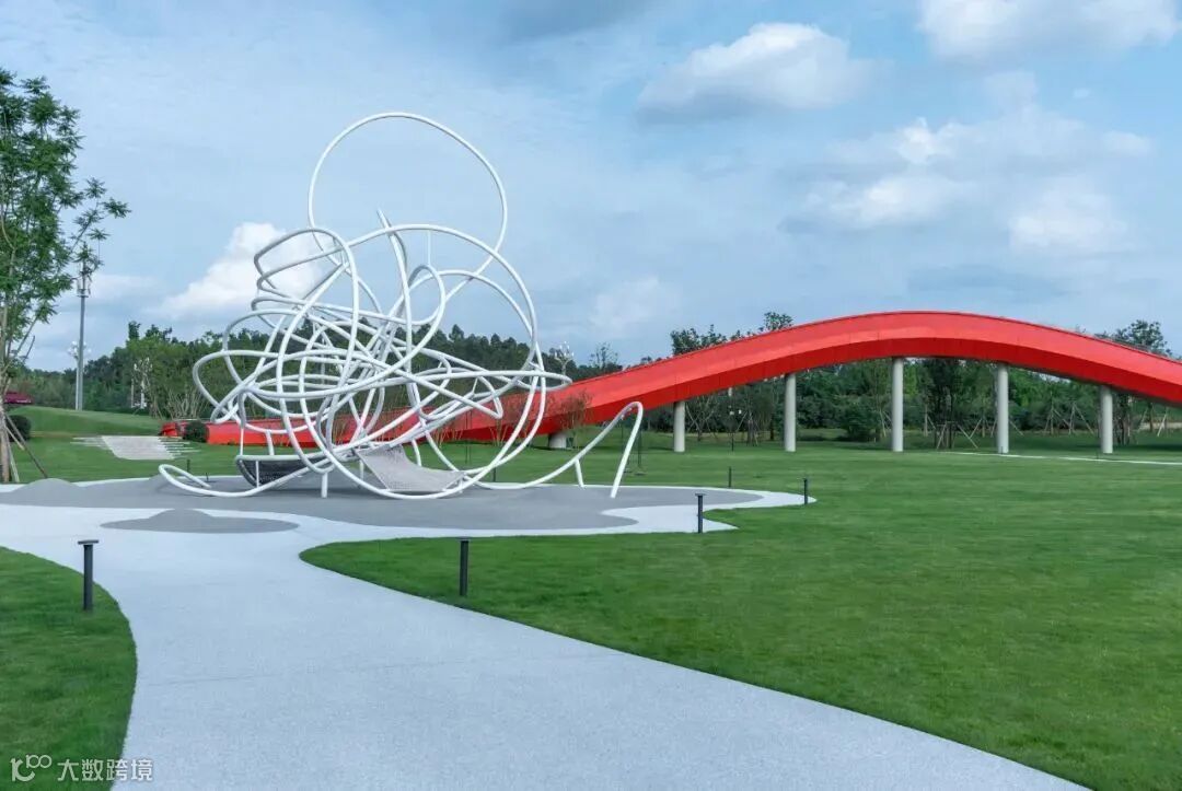 另一边,“混沌线条”装置立于一片纯净、空旷之中,看似无序、混乱的白色线条在天空、草地、建筑的映衬下透出独特的艺术美,但它不止是艺术品,而是结合了攀爬、跳跃、秋千等诸多体验功能,以打破常规、不拘一格的形式激发参与者更多想象力,在快乐的探索中找寻未来。