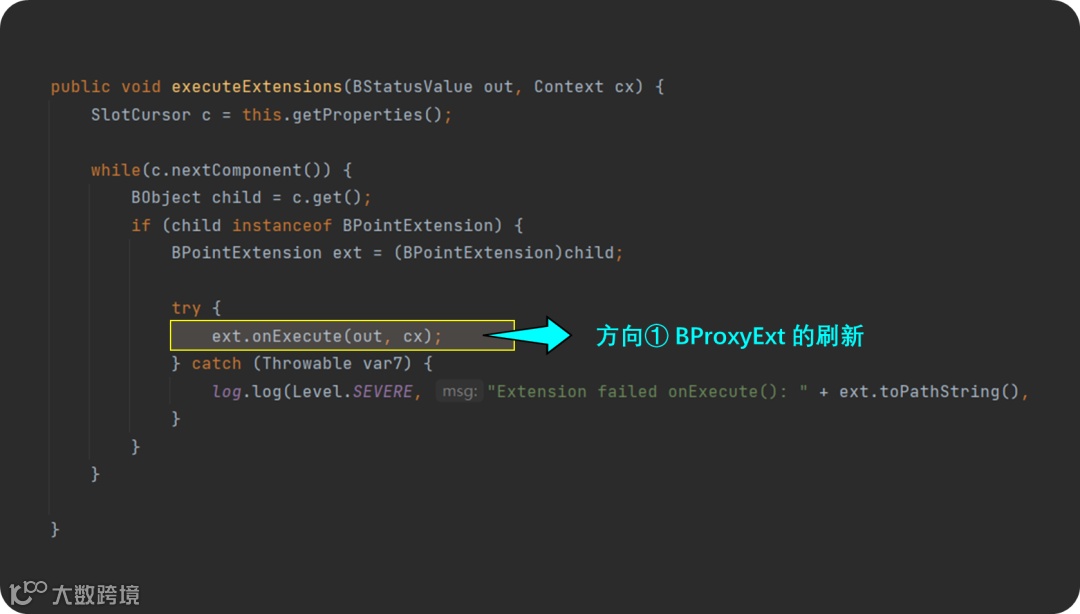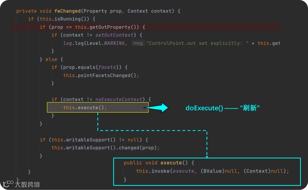 当前例子中,由于 fallback 下游并没有任何 BLink 连接,所以此处方向③上不会发生任何事情。接下来 fireComponentEvent() 会通知当前点(某个属性)发生了“变化”,也就是 fwChanged() 方法,这个方法中会调用 BControlPoint 中至关重要的一个方法 ——execute(): “刷新” 。