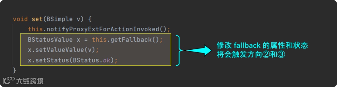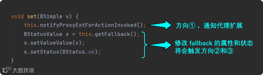 Set() 方法中,先通知代理扩展有 set 操作(Action) 被触发(方向①),然后修改 fallback 属性及其后续在方向②和③上的影响。