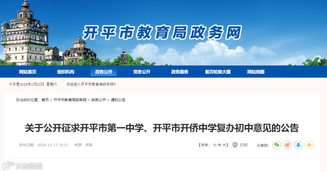 开平市第一中学、开平市开侨中学的初中部于2025年9月正式开办。