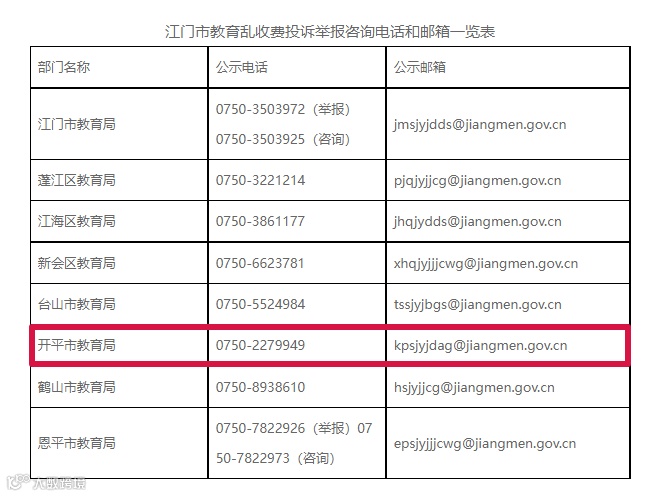 为进一步畅通群众监督投诉举报咨询途径,按照《教育部等五部门关于进一步加强和规范教育收费管理的意见》(教财〔2020〕5号)的相关要求,江门市设立了教育乱收费投诉举报咨询电话和邮箱,受理相关投诉举报、咨询答疑。