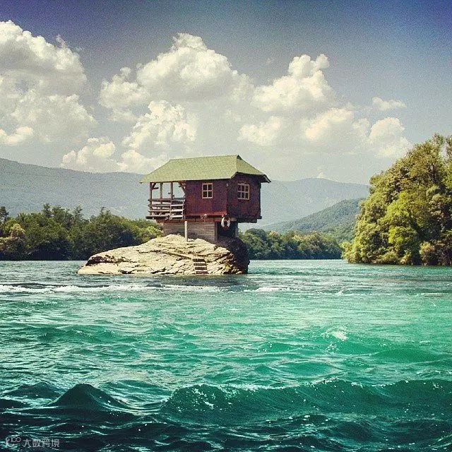 在德里纳河中心位置的石头上,屹立着一个小木屋,在广廖的河面,难免显得有些凄凉。