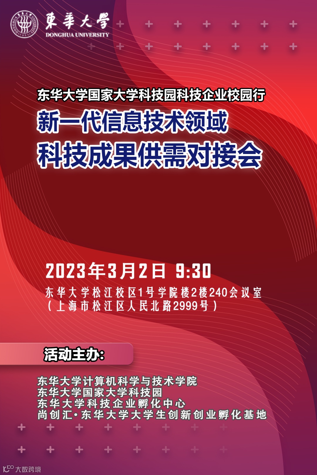 2023年3月2日9:30,东华大学计算机科学与技术学院、东华大学国家大学科技园、东华大学科技企业孵化中心、尚创汇·东华大学大学生创新创业孵化基地联合主办“东华大学国家大学科技园科技企业校园行——新一代信息技术领域科技成果供需对接会”活动,邀请科技企业创业者了解东华大学最新科技成果,对接产学研合作需求,欢迎点击左下角“阅读原文”报名参与~