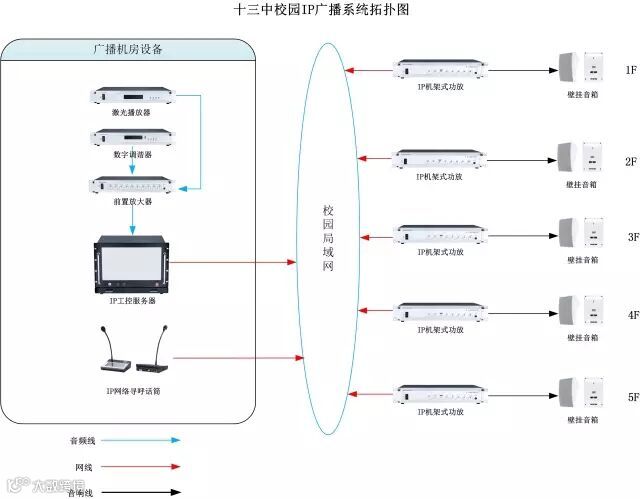 主要划分三部分组成,音乐教室需要到一套音质优美的专业设备,以满足上音乐课及课余学生音乐训练的需要。会议室则要求满足声音宏亮清晰的要求,能满足会议讲话扩声需要。校园内则需要能满足日常教学广播需要,打铃,广播通告等多种功能。设备需要配置合理,实用性高,稳定可靠。