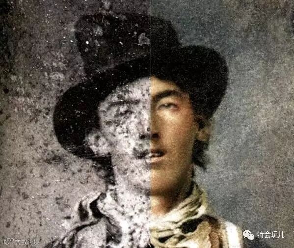 一百多年前比利小子的照片,左半边是原片,右半边是后来经过修复并上色的。比利小子在美国是位家喻户晓的传奇人物,有人说他是位神枪手,是个除暴安良的西部牛仔英雄;也有人说他是个不法之徒,谋杀了21个人。