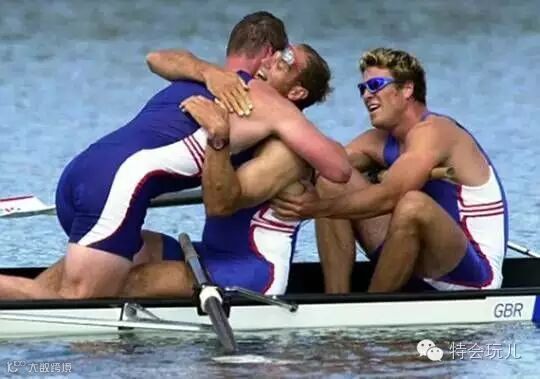 悉尼奥运会,38岁“高龄”的糖尿病患者雷德格雷夫(Steve Redgrave)(中)夺得了第五块奥运金牌后和队友相拥庆祝。