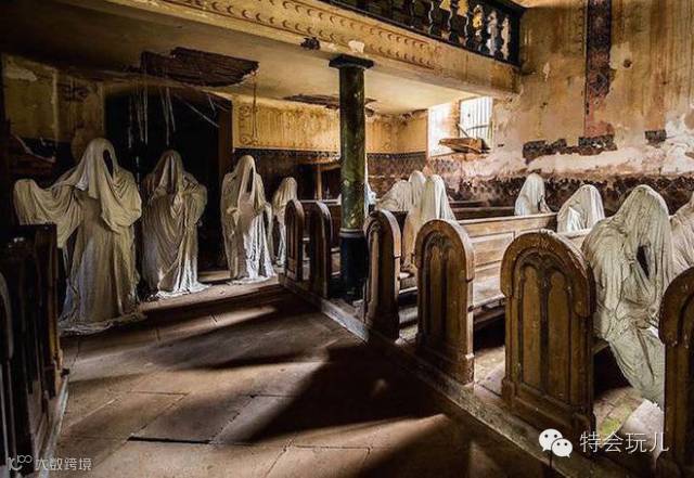 他利用他的同学当模特,将他们包裹在塑料和雨衣里。慢慢的三十只鬼魂“活”在了圣乔治教堂,在这个年久失修的地方创造出了一种诡异的氛围。