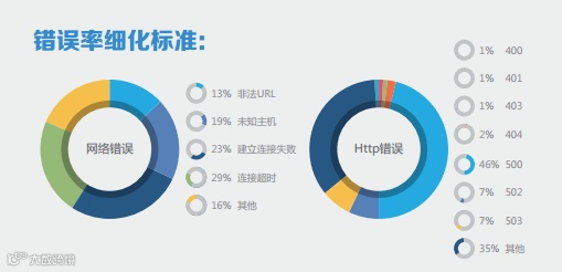 移动应用错误顾名思义为,应用在生产环境下所出现的网络错误和HTTP(HTTP状态码)汇总。移动应用错误会造成应用页面无法显示,影响用户体验。据统计,连接超时、建立连接失败、非法主机和非法URL占领了错误细分排行前几位。在HTTP错误中,“500”以46%占比居首。