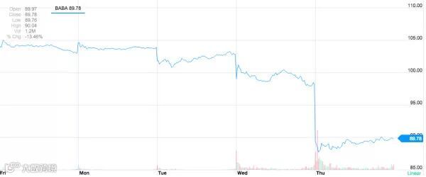下图是阿里巴巴(BABA)最近五日的股价表现,用“断崖式跌落”来描述并不过分。这是阿里股价去泡沫化的开始吗?