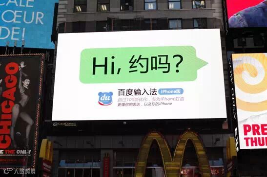 2014年10月,百度输入法iPhone版亮相"世界十字路口"纽约时报广场广场大屏,极具中文表达特点的文案"Hi,约吗?",约请华人使用自家输入法。