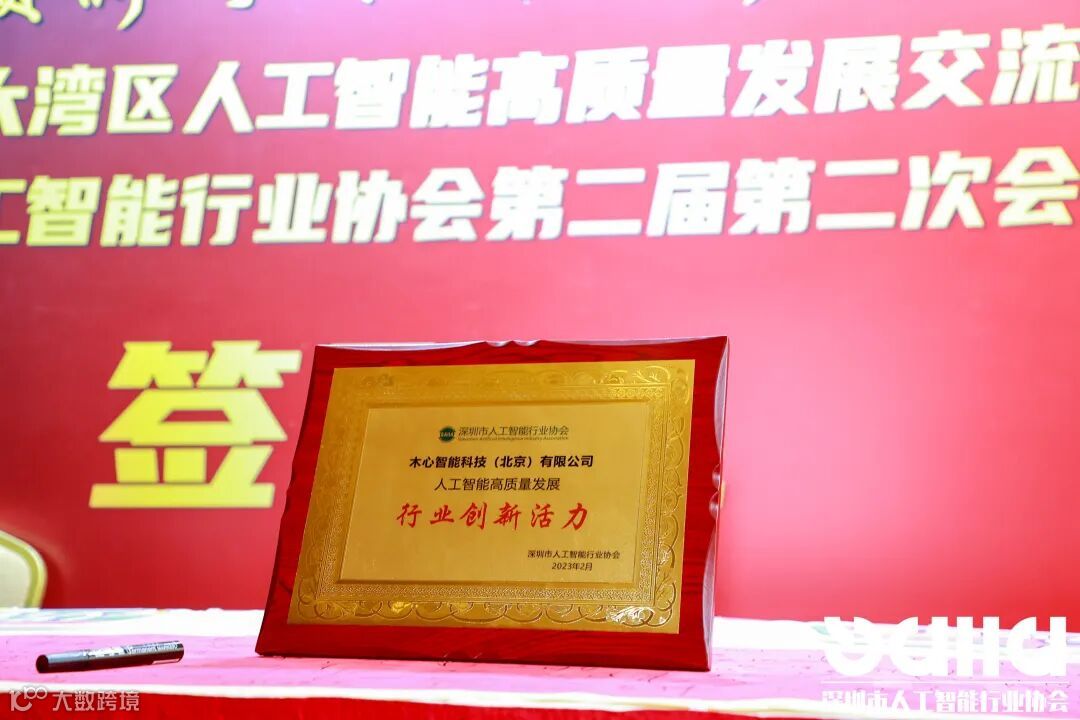 2023年2月9日,粤港澳大湾区人工智能高质量发展交流会暨深圳市人工智能行业协会第二届第二次会员大会成功举办。木心智能在120多家企业中脱颖而出,荣获“2022人工智能高质量发展行业创新”活力奖项。