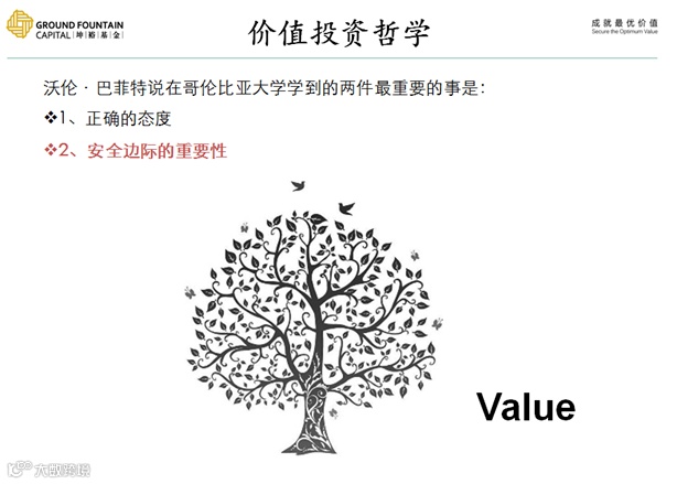 首先看我们第一页图,是一个简单生动的图片,非常圆满的树,两只小鸟,是由下而上一个丰富的营养供给的,一张生动的成长体系生态图向大家展示了价值投资的核心理念。