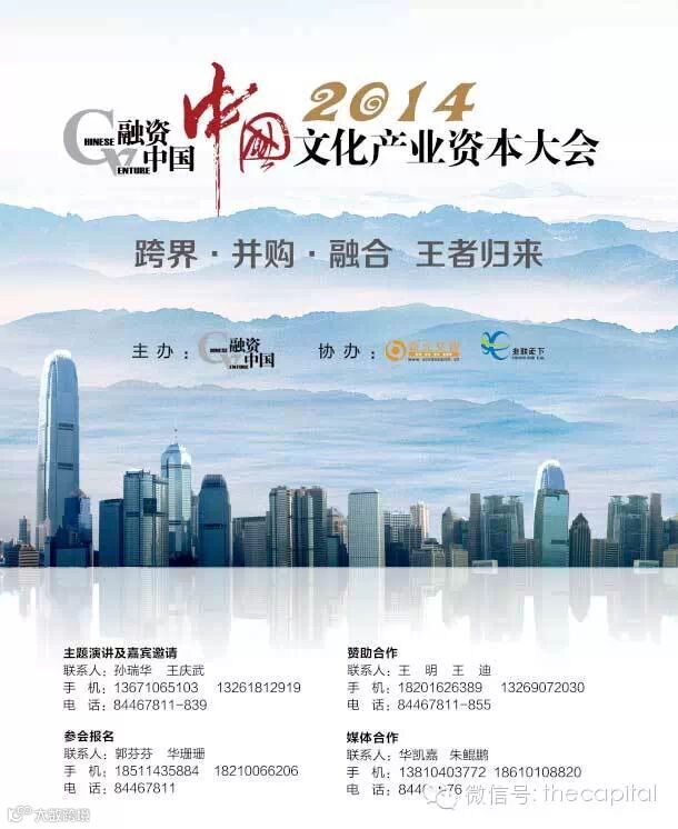 导读:2014,文化产业突飞猛进,资本市场强者归来,大事频发。三大发展趋势显著:内容化、在线化、国际化。各级政府加大支持力度,政策利好不断。从财税、投融资,到各层次资本市场异常给力!特别是伴随混合所有制改革的不断深化,体制创新将带来更多的投资机遇。中国,从文化大国,向文化强国迈进的号角已然吹响,你还在等什么?来吧,2014.7.18北京,由《融资中国》杂志牵头主办的这场文化资本大会的饕餮盛宴,期待你的到来!