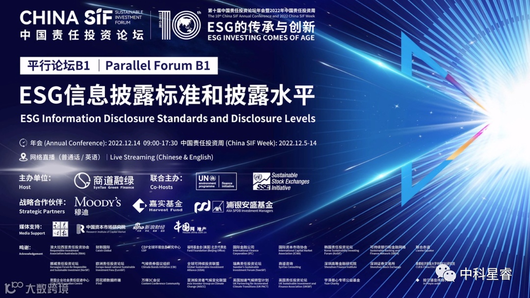 中科星睿战略副总裁潘铃应大会邀请,参与了”ESG信息披露标准和披露水平”的圆桌讨论环节。在商道咨询合伙人郎华的主持下,潘铃与彭博中国绿色金融协调人程海波、中国上市公司协会公司治理部总监刘彦沣、国务院国资委研究中心国际合作研究处副处长戚悦、CDP全球环境信息研究中心中国项目副主任李蜚,一起分享了ESG信息披露对各家机构的重要性、畅谈高水平ESG信息披露应具备的特征、探讨ESG信息披露的现状和挑战、针对国际可持续准则理事会(ISSB)目前正在推动的两个报告指引各抒己见、并纷纷表达愿意通过合作机制促进ESG信息披露标准化和规范化,从而共同提升整体ESG信息披露水平。