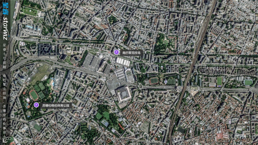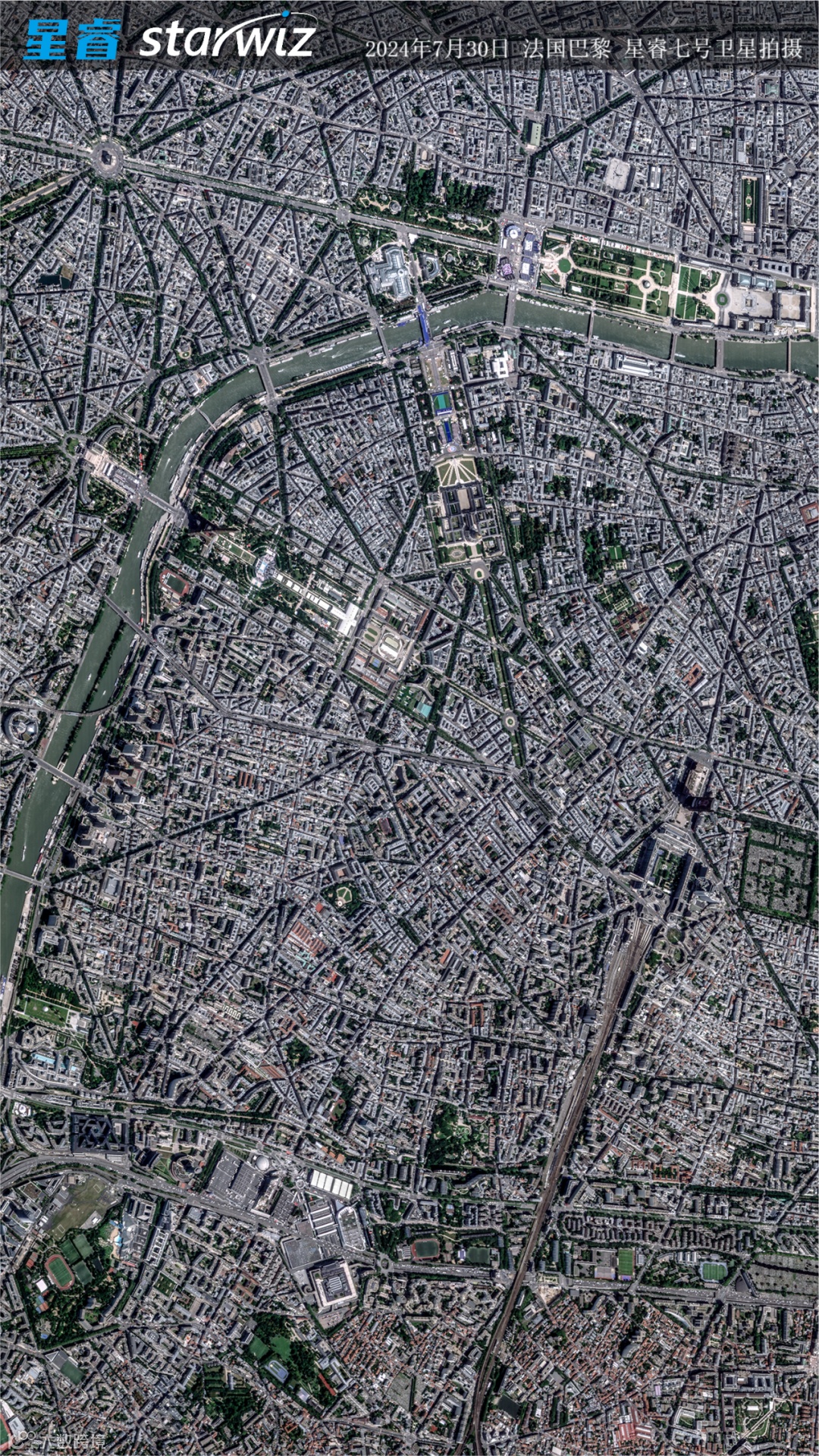 接下来,请跟随星睿七号卫星的视角,一起俯瞰位于法国巴黎市中心的各个运动场馆,体验一场云端城市漫步。