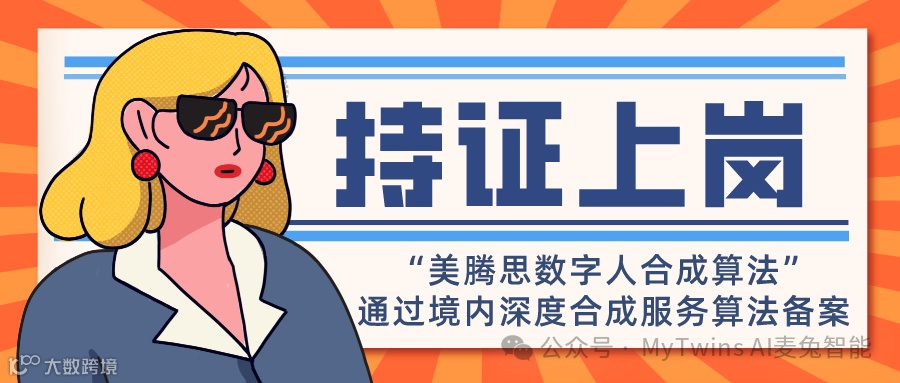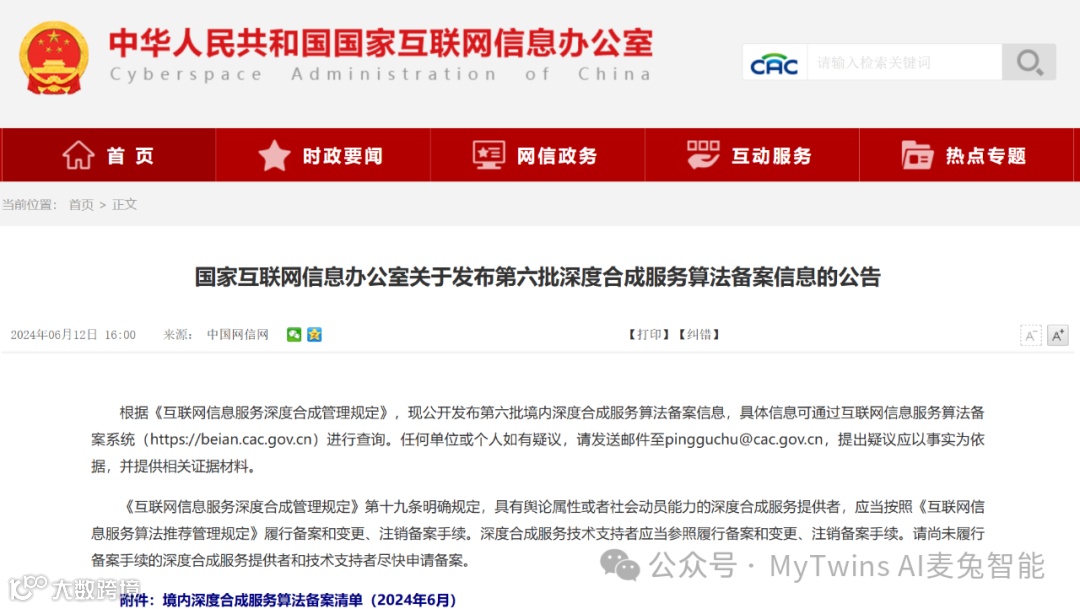 6月12日,国家互联网信息办公室发布第六批境内深度合成服务算法备案信息公告,由MyTwins.ai自主研发的“美腾思数字人合成算法”通过深度合成服务算法备案,备案编号:330110545364901240019号。