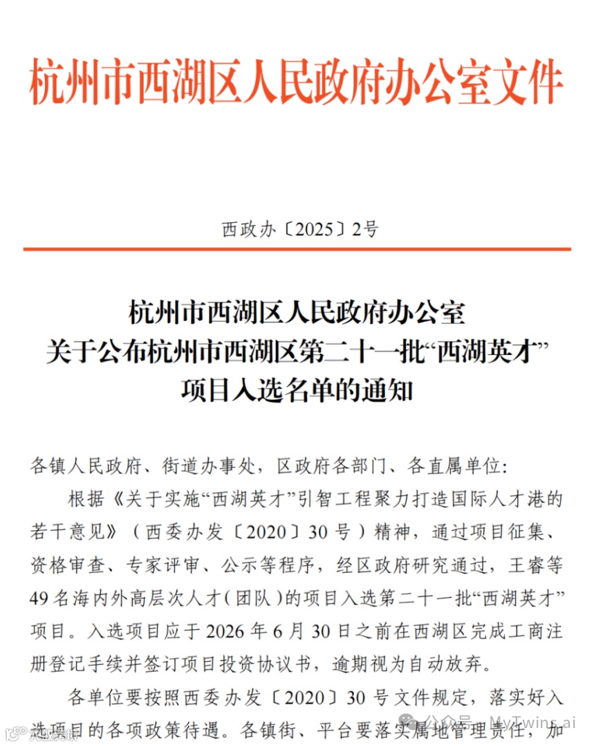 感谢政府支持,致敬创新沃土。MyTwins.ai入选西湖区“西湖英才”项目,感谢杭州西湖区政府的信任与支持,政府提供了资金和展示平台。在杭州,我们见证科技创新浪潮,涌现DeepSeek、宇树科技等AI公司。杭州的科创环境,提供资源机遇,注入前行动力。
